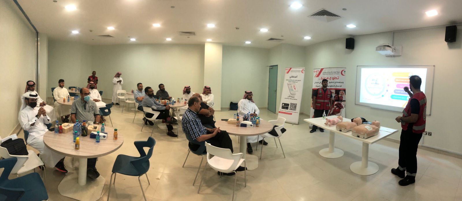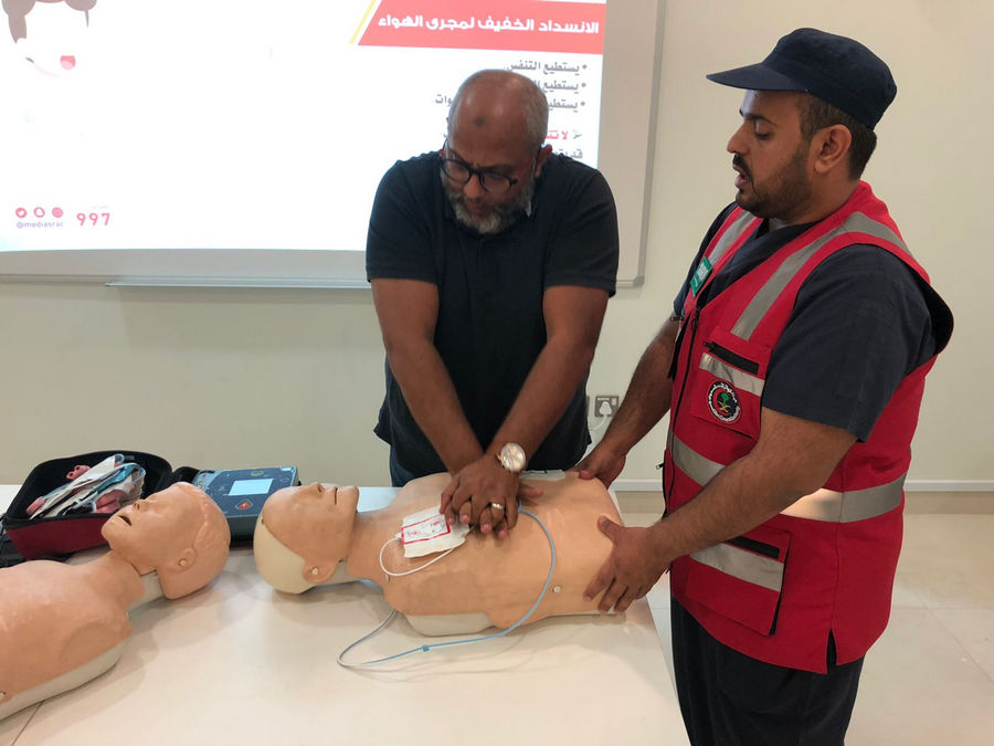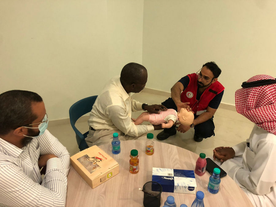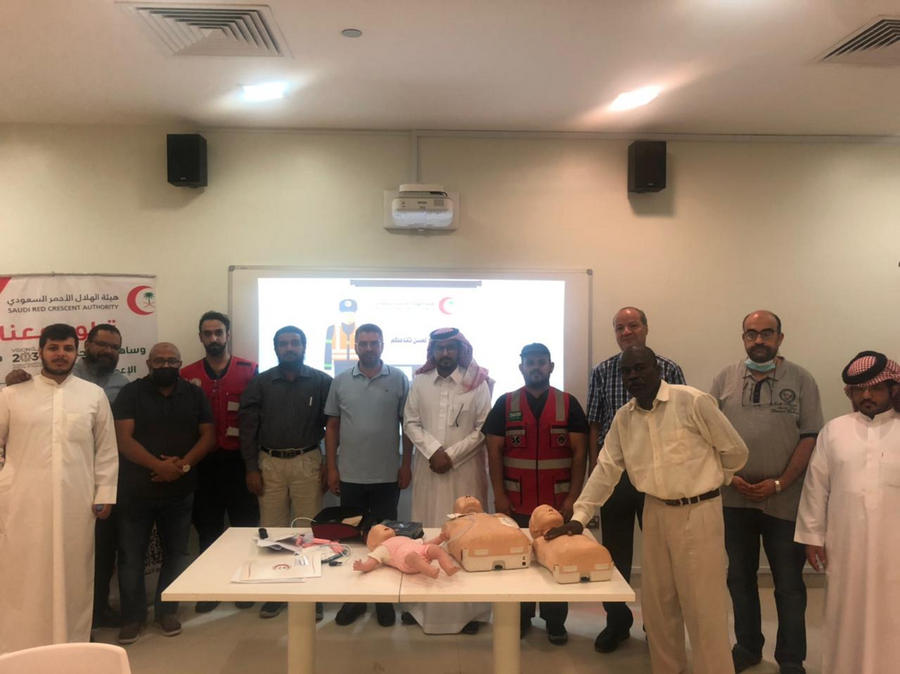 The Saudi Red Crescent Authority members opened the training course by mentioning the most important instructions in a number of emergency cases and taking correct and quick solutions to deal with these situations. The most important topics that were raised are: