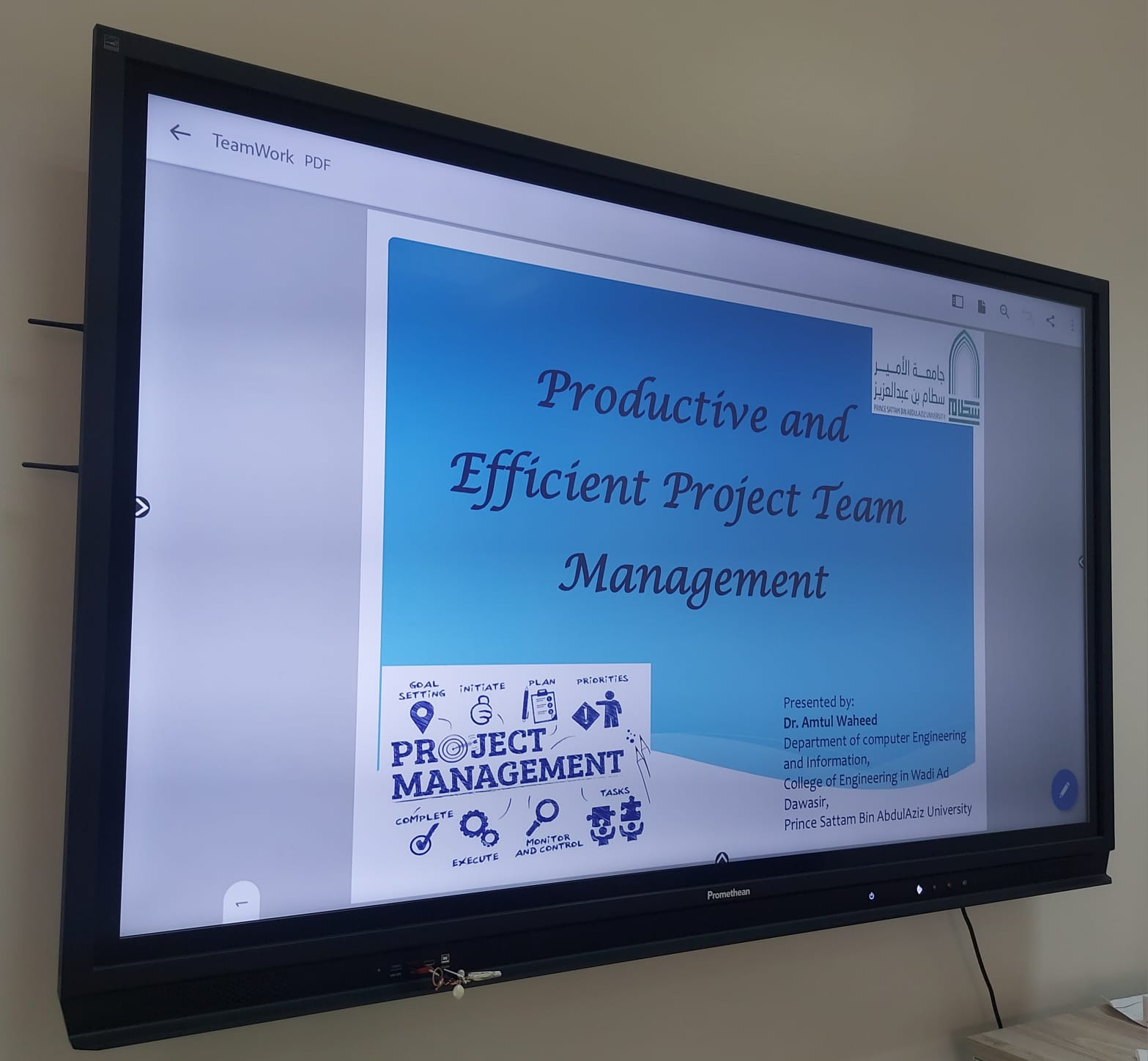 The female section’s Graduation Projects Committee, represented by Alumni Committee of, Department of Computer Engineering and Information- College of Engineering in Wadi Al Dawasir, held a workshop entitled “ Productive and Efficient Project Team Management”, presented by Ms. Amtul Waheed lecturer Department of Computer Engineering and Information on Tuesday, 07/05/2024, 10.00 -11.00 am. The workshop was aimed to deliver: