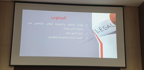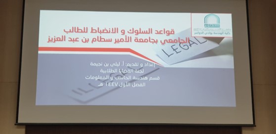 وقدمت الأستاذة ليلى بنت الهادي بن نجيمة، عضو هيئة التدريس بقسم هندسة الحاسب والمعلومات، ندوة بعنوان «قواعد السلوك والانضباط للطالب الجامعي بجامعة الأمير سطام بن عبد العزيز»، يوم الأحد 06/04/1447هـ من الساعة 11:40 صباحًا حتى 1:30 ظهرًا، ويوم الثلاثاء 08/04/1447هـ من الساعة 11:00 صباحًا حتى 1:00 ظهرًا، على مسرح الكلية بالدور الثاني.