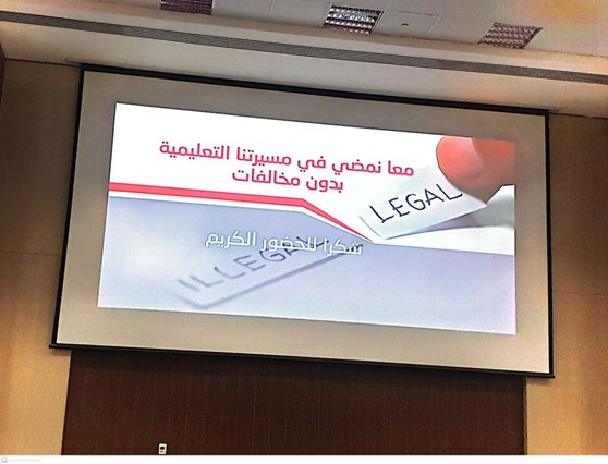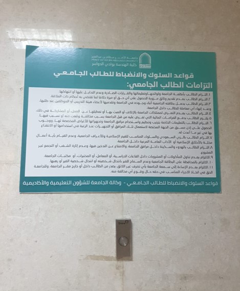 كما تم إعداد لوحات تعريفية وضعت في ممرات المبنى، تناولت التزامات الطالب الجامعي وقواعد السلوك في الجوانب الأكاديمية وغير الأكاديمية، بهدف توعية جميع الطالبات.