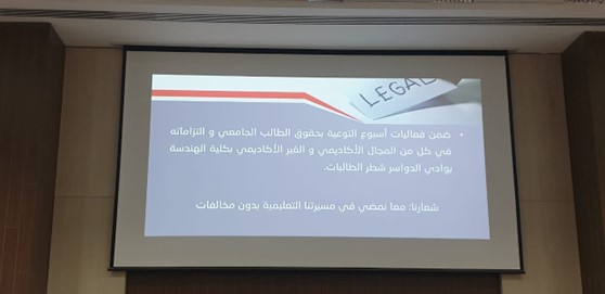 ضمن جهودها في نشر الوعي بالسلوك الجامعي المنضبط، نظمت كلية الهندسة بوادي الدواسر – شطر الطالبات – أسبوعاً توعوياً بعنوان «معًا نمضي في مسيرتنا التعليمية بدون مخالفات»، بإشراف لجنة القضايا الطلابية بقسم هندسة الحاسب والمعلومات.