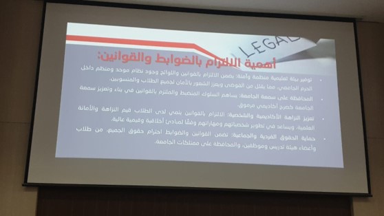 • أهمية الالتزام بالضوابط والقوانين ودورها في توفير بيئة تعليمية منظمة وآمنة، وحماية الحقوق الفردية والجماعية، وضمان استقرار العملية التعليمية.